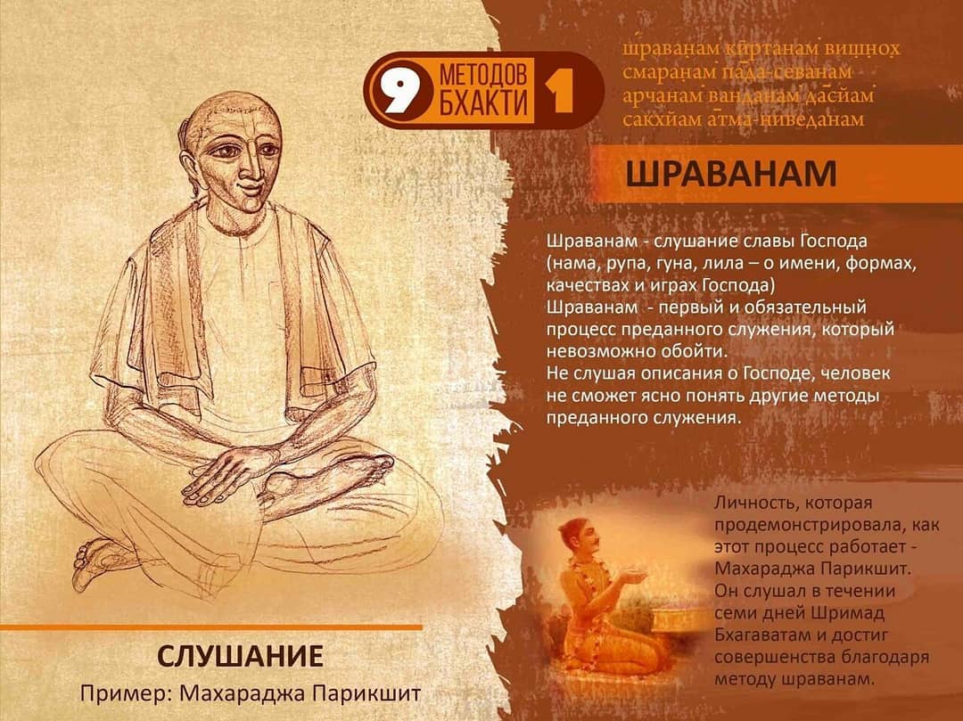 Шраванам - внимательное слушание. Слушание трансцендентных описаний, Имён, форм, качеств, игр и спутников Бхагавана из уст продвинутых преданных. Одна из девяти наиболее важных составляющих бхакти.