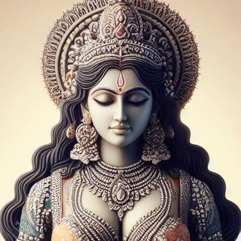 Это Богиня Деви Махатмьи в её самом универсальном проявлении – та Богиня, которую прославляют в первой главе как придающую форму даже величайшим богам. Таким образом, в Деви Махатмье Божественное Женское Начало предстаёт во множестве личностных форм, включая: Изначальную и пронизывающую собой всё сущее Великую Богиню, именуемую Махадеви, Махамайя, Тамаси, Каларатри, Махакали; Образы богинь-воительниц, носящих имена Чандика, Дурга, Бхадракали; Парвати, «дочь Горы», умиротворённая и бесстрастная сторона которой носит имя Калика; Великаншу-воительницу, именуемую Кали Каралаваданой и Чамундой.
